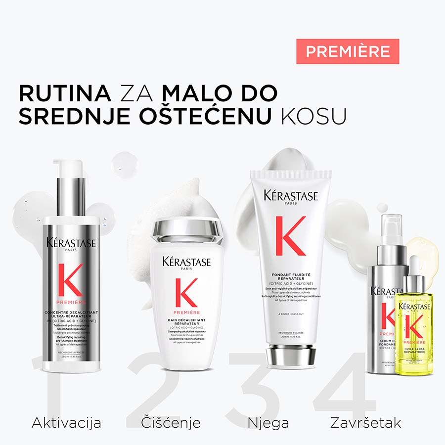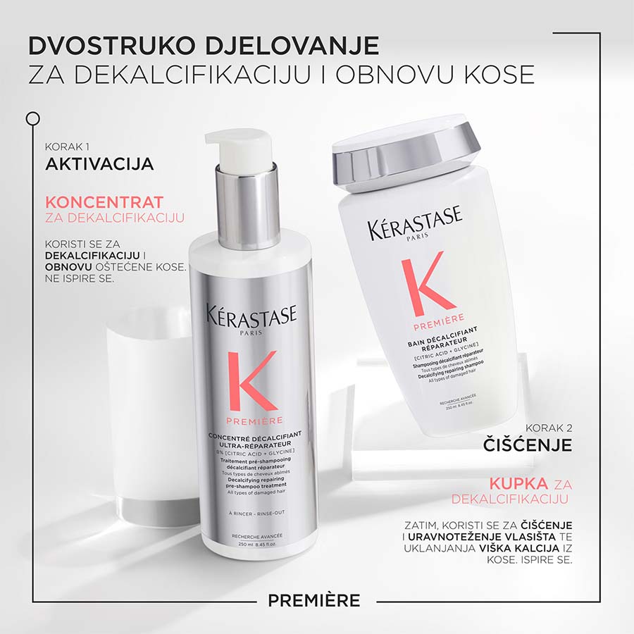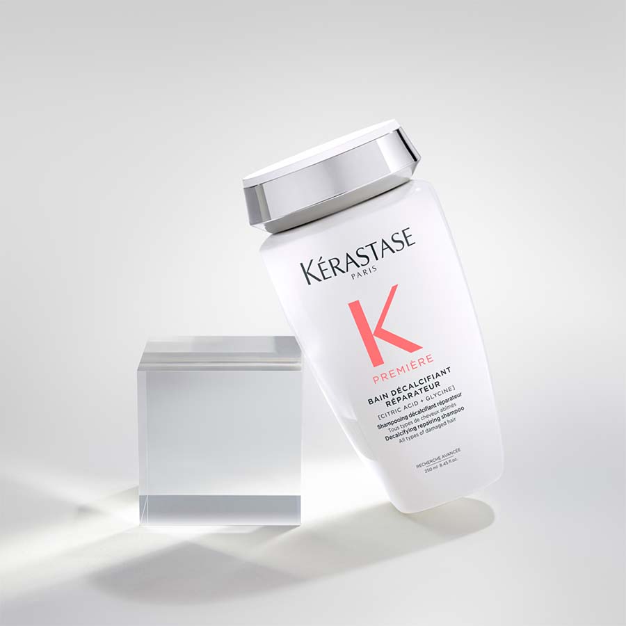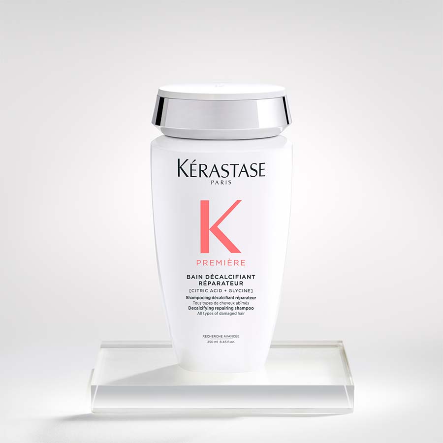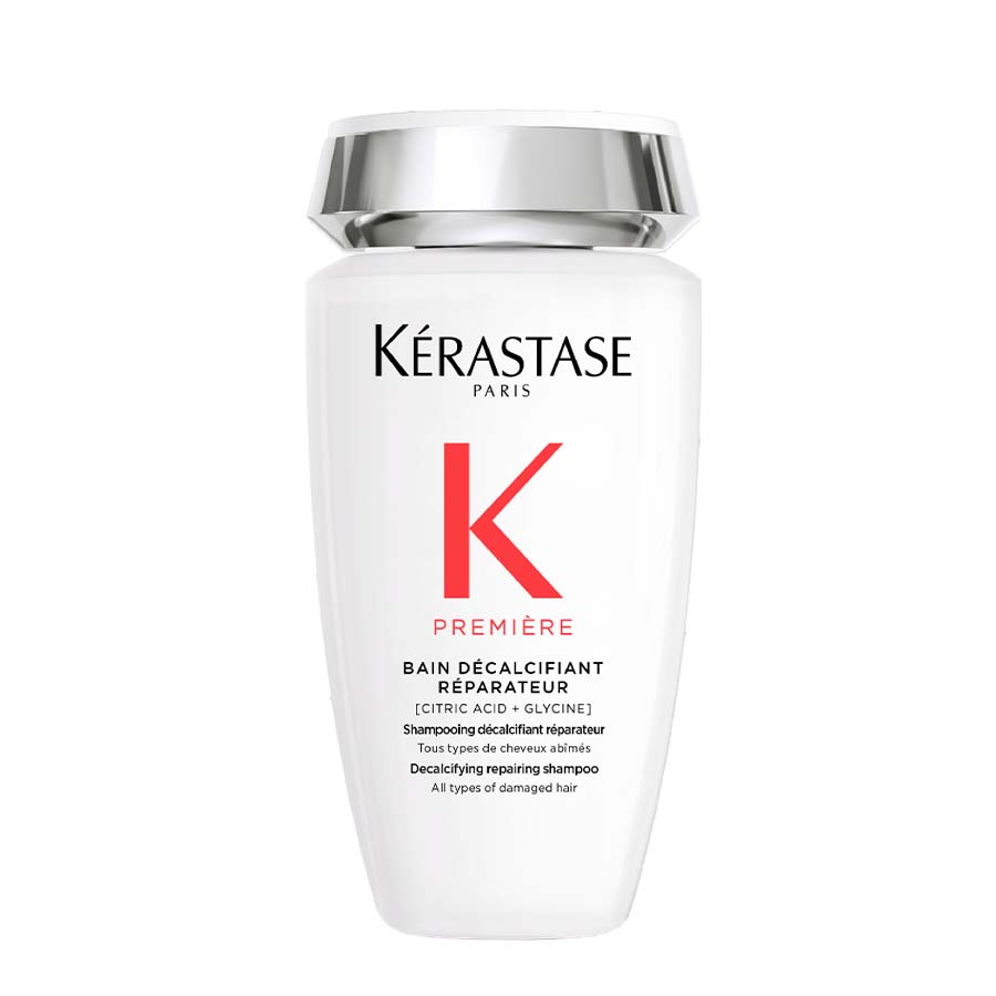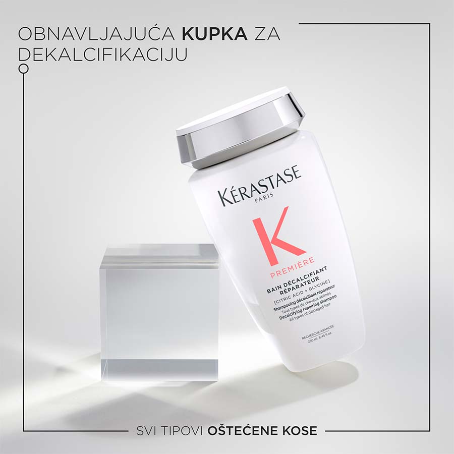 Kérastase Première Bain Décalcifiant Réparateur je šampon za dekalcifikaciju i popravak namijenjen svim vrstama pretrpane ili oštećene kose. Ovaj profesionalni šampon bez sulfata nježno čisti vlasište i kosu, istovremeno uklanjajući kalcij, koji dodatno oslabljuje tretiranu kosu. Kosa se popravlja iznutra prema van, smanjuje se lomljenje, a njezino zdravlje obnavlja.